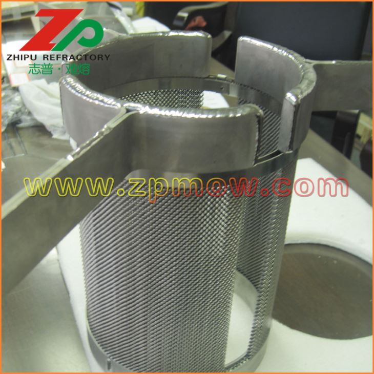 發(fā)熱體一般采用鳥籠結(jié)構(gòu)鎢發(fā)熱體或者鎢絲網(wǎng)發(fā)熱體,有利于提供均勻穩(wěn)定的溫場。 鎢絲網(wǎng)發(fā)熱體組件做為藍(lán)寶石晶體生長爐內(nèi)的熱源,對鎢坩堝內(nèi)的熔液形成湍流、產(chǎn)生徑向溫度梯度具有決定性的作用。因此,具有高純度、高密度、制作精良、設(shè)計(jì)合理的鎢絲網(wǎng)發(fā)熱體組件對藍(lán)寶石晶體的質(zhì)量控制,節(jié)約能源以及使用壽命具有重要意義。